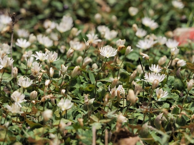 枯れ葉の散り敷いた道の真ん中まで、たくさんの花が咲いていた。