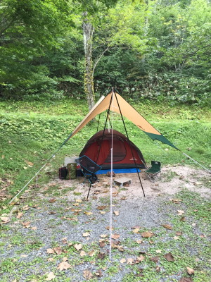 夜から雨になるとの予報を受けて、タープの中にテントを張る。
