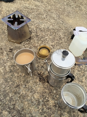 ミルクも沸かして、たっぷりのミルクコーヒーと、チョコケーキで元気回復。