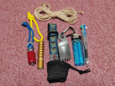 (左から)バード・コール。ルミントップ・ワーム、ゴールデン・イエロー。熊鈴。CRKT、IOTA。簡易ライター。ミニ4色ボールペン。麻ひも。