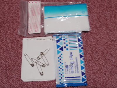 応急絆創膏。ポケットティシュー。ウエットティシュー。メモ紙。安全ピン。