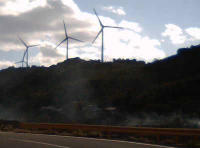 角島側から本土を見ると、風力発電の風車が遠くに見える。