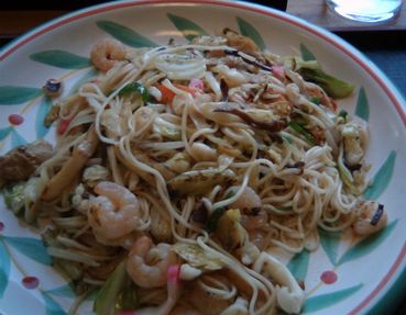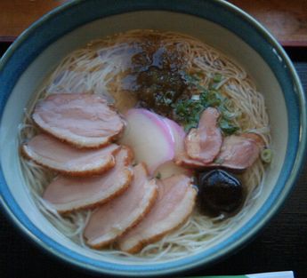 土産物屋の食堂で、肉うどんとおむすびの昼食。